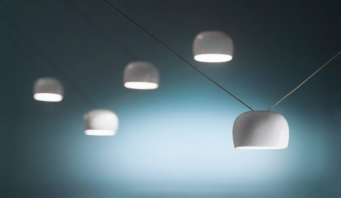 Provides direct downward light with a wide light beam angle dichroic bulb. It works with LED light bulbs. It is used for general lighting or on dining tables, working and reading areas when the light source needs to be hidden. It is made of white enamelled hand-crafted ceramic.